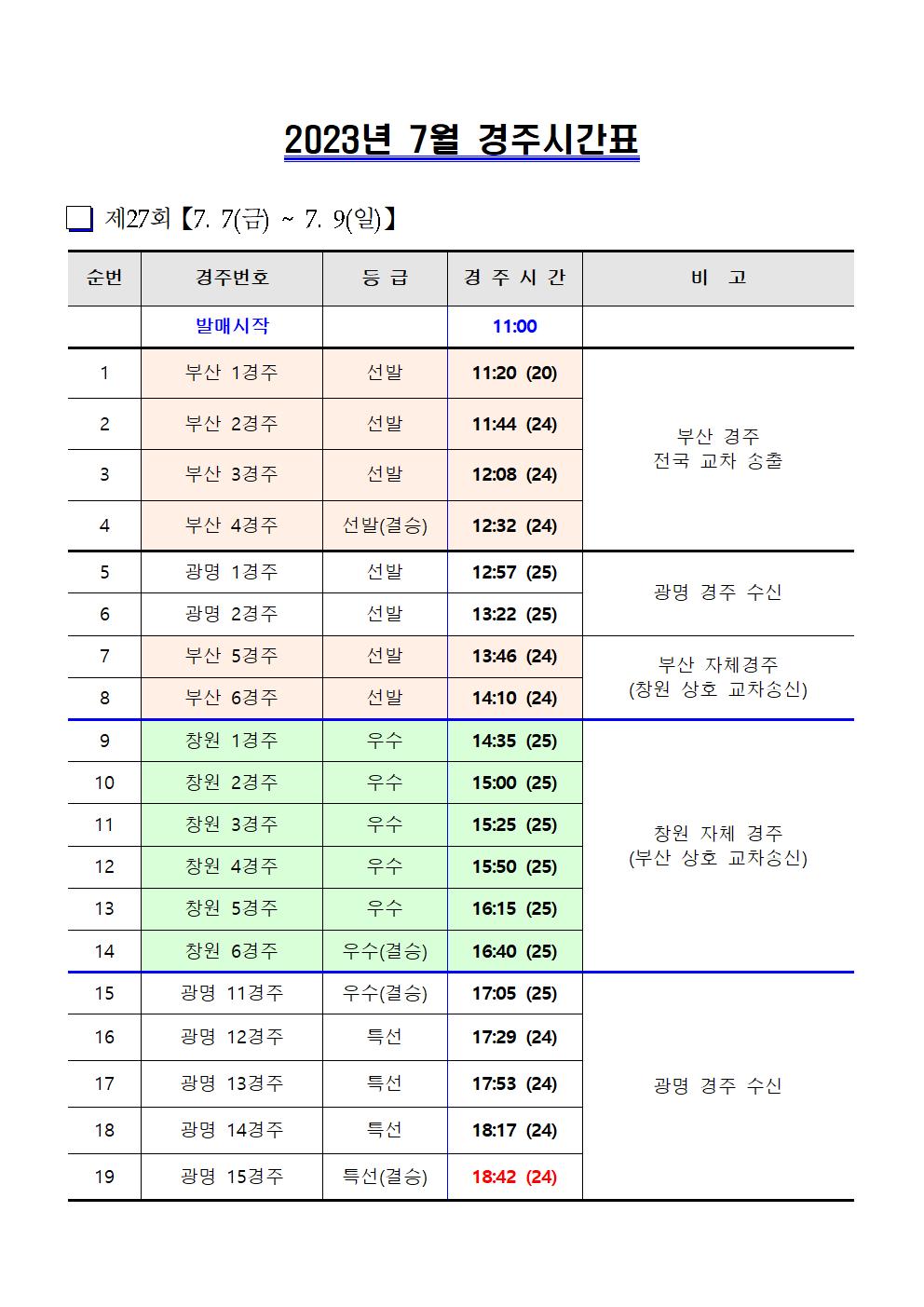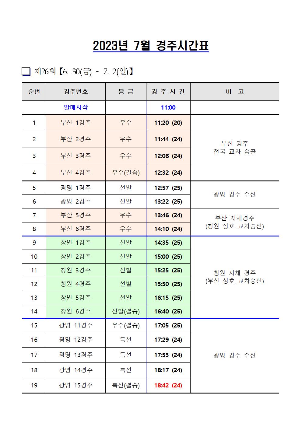 | 창원경륜 제26~27회 경주시간표(6.30~7.9) | |