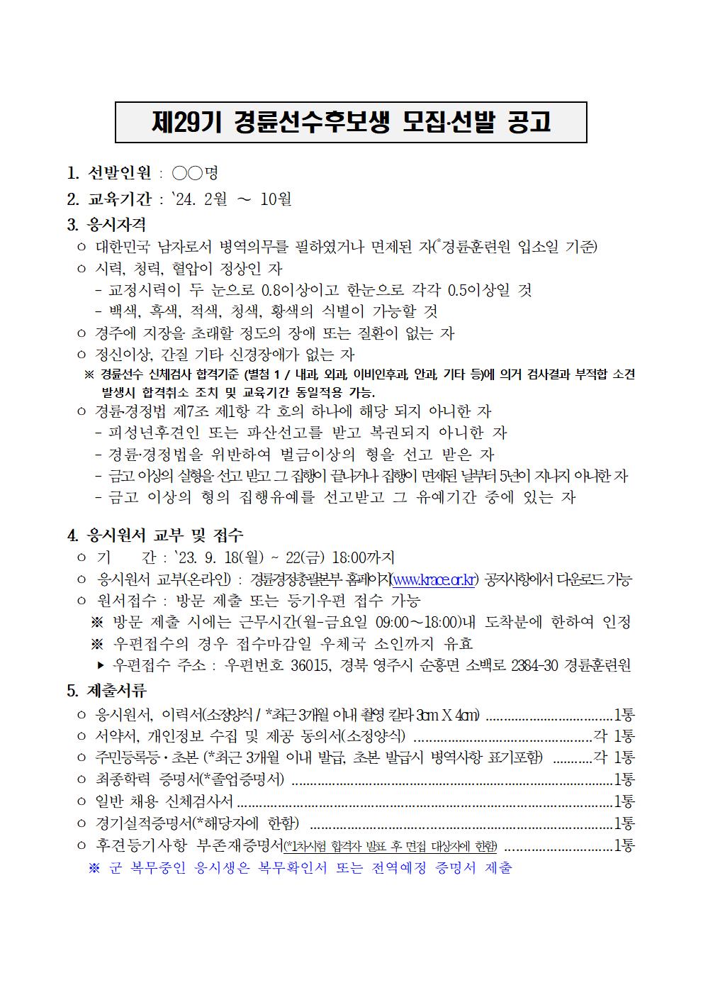 | 제29기 경륜선수후보생 모집 선발 공고문 | |