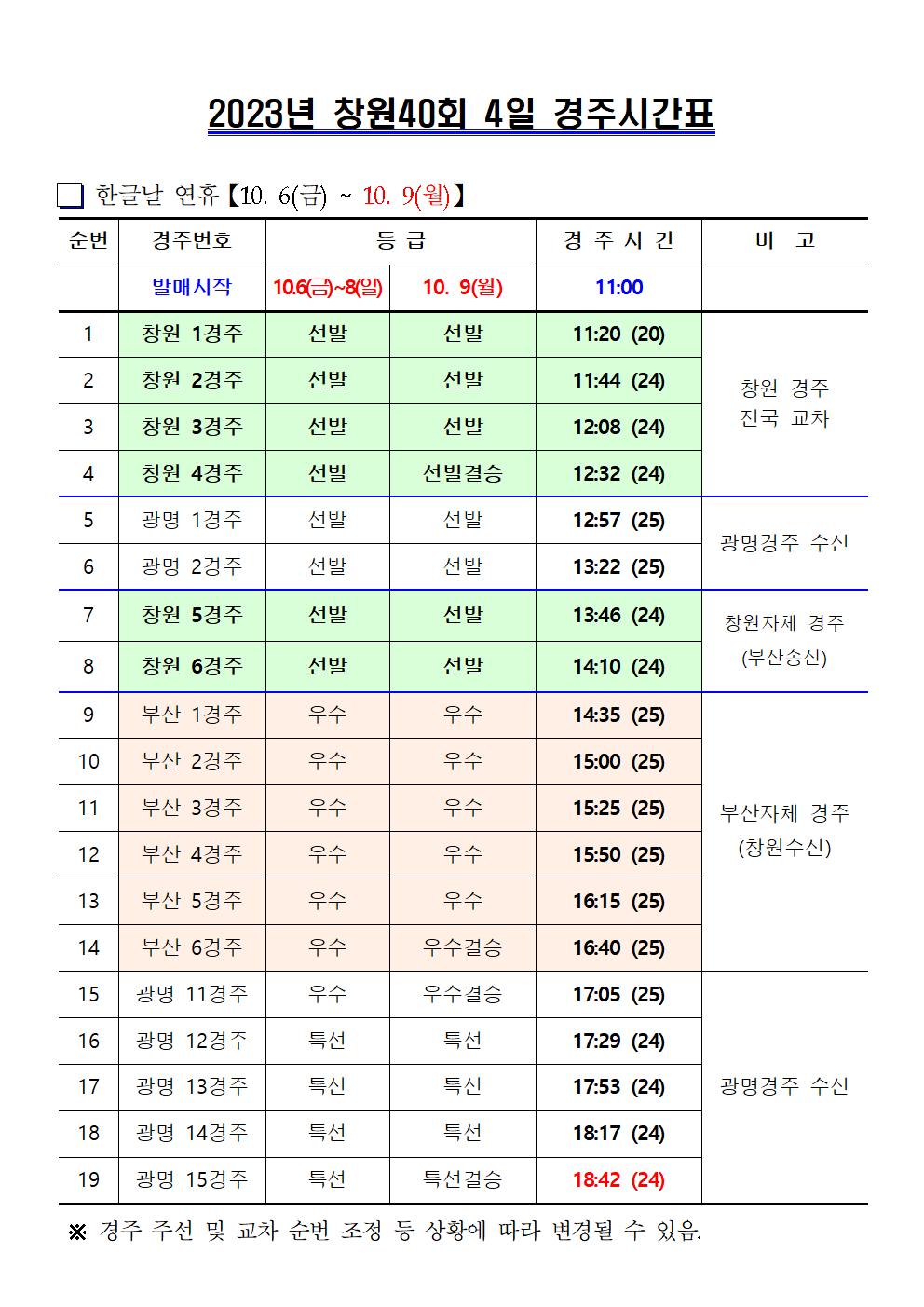 | 창원 제39회(추석 2일 경륜), 제40회(한글날 4일 경륜) 경주시간표 안내 | |