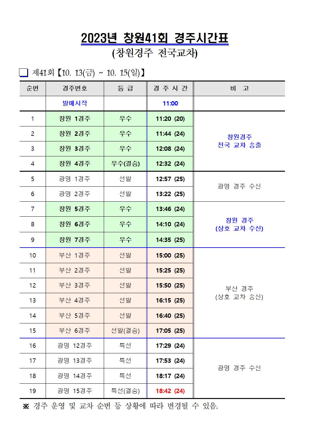 | 창원경륜 10월(41~43회) 경주운영 및 시간표 안내 | |