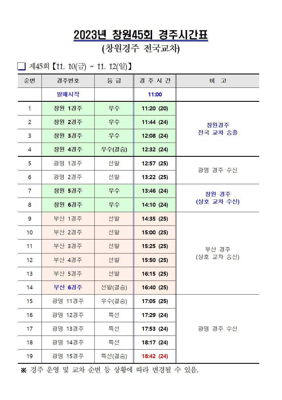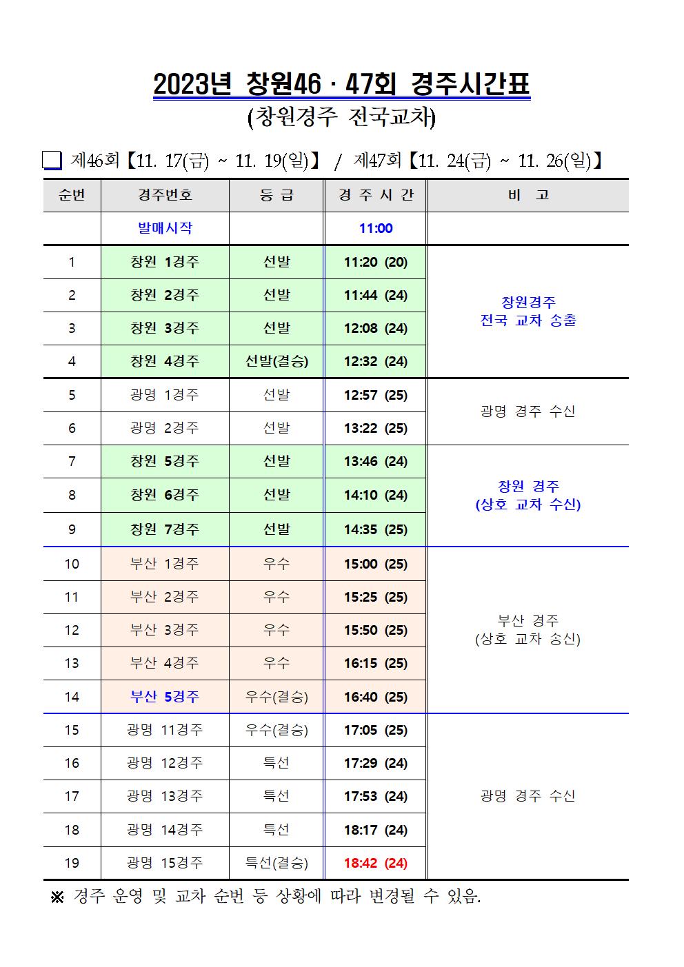 | 창원경륜 11월(44~47회) 경주운영 및 시간표 안내 | |