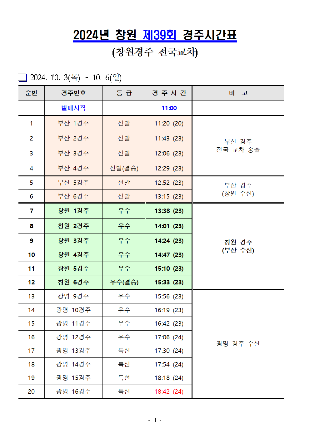 | 창원경륜 10월 (제39~39A회) 경주시간표 안내 | |