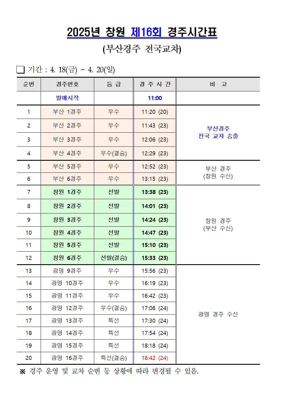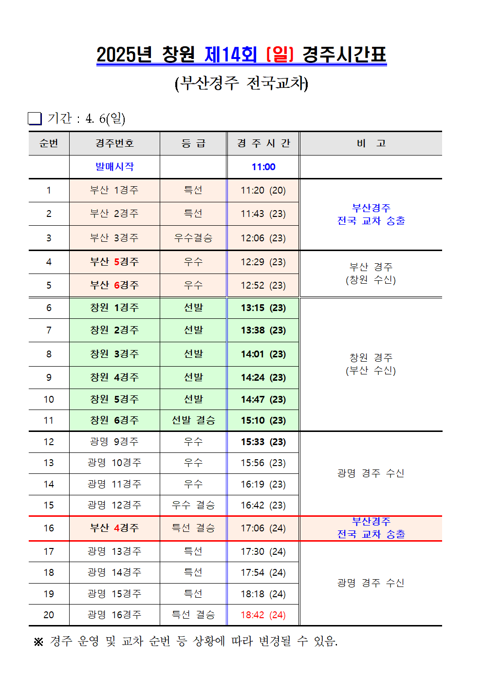 | 2025년 창원경륜 제 14~17회 경주시간표 | |