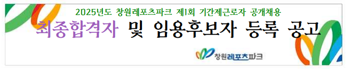 2025년도 창원레포츠파크 제1회 기간제제근로자 공개채용(청년 체험형 인턴) 최종합격자를 다음과 같이 공고합니다. 2025년 1월 22일 창원레포츠파크이사장 |