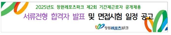 | 2025년도 창원레포츠파크 제2회 기간제근로자 공개채용 서류전형 합격자 발표 및 면접시험 일정 공고 | |