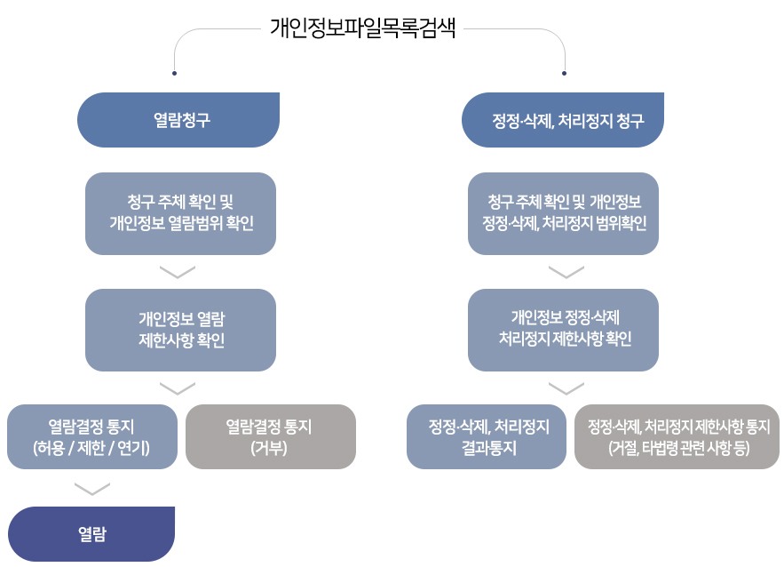 개인정보파일목록검색후 1.열람청구 > 청구주체 확인 후 개인정보 열람범위 확인 > 개인정보 열람 제한사항 확인 > (허용/제한/연기)열람결정 통지하거나 (거부)열람결정 통지 > 허용/제한/연기 통지시 열람 청구 가능, 2.개인정보파일목록의 정정,삭제,처리정지 청구시 > 열람청구후에 청구주체확인 및 개인정보 정정,삭제, 처리정지 범위 확인 > 개인정보 정정, 삭제, 처리정리 제한사항 확인 > 정정,삭제, 처리정지 결과를 통보하거나 , 정정,삭제, 처리정지 제한사항 거절 통지 혹은 타법령 관련사항에 따라 거절 됨을 통보