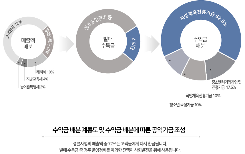 총매출액에서 고객환급금 72%와 세금 (레저세:10%+지방교육세:4%+농어촌특별세:2%)16%를 제외한 발매수득금 12%에서 경주사업운영경비를 제외한 수익금은 각종 기금과 지방체육진흥, 중소기업창업 및 진흥기금 등 각종 기금으로 적립되어 전액 사회발전을 위해 사용됨,