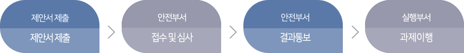 4. 처리절차 1.제안서 제출 > 2. 안전부서에서 접수 및 심사 > 3. 안전부서에서 결과를 통보 > 4. 실행부서에서 전달받은 과제 이행