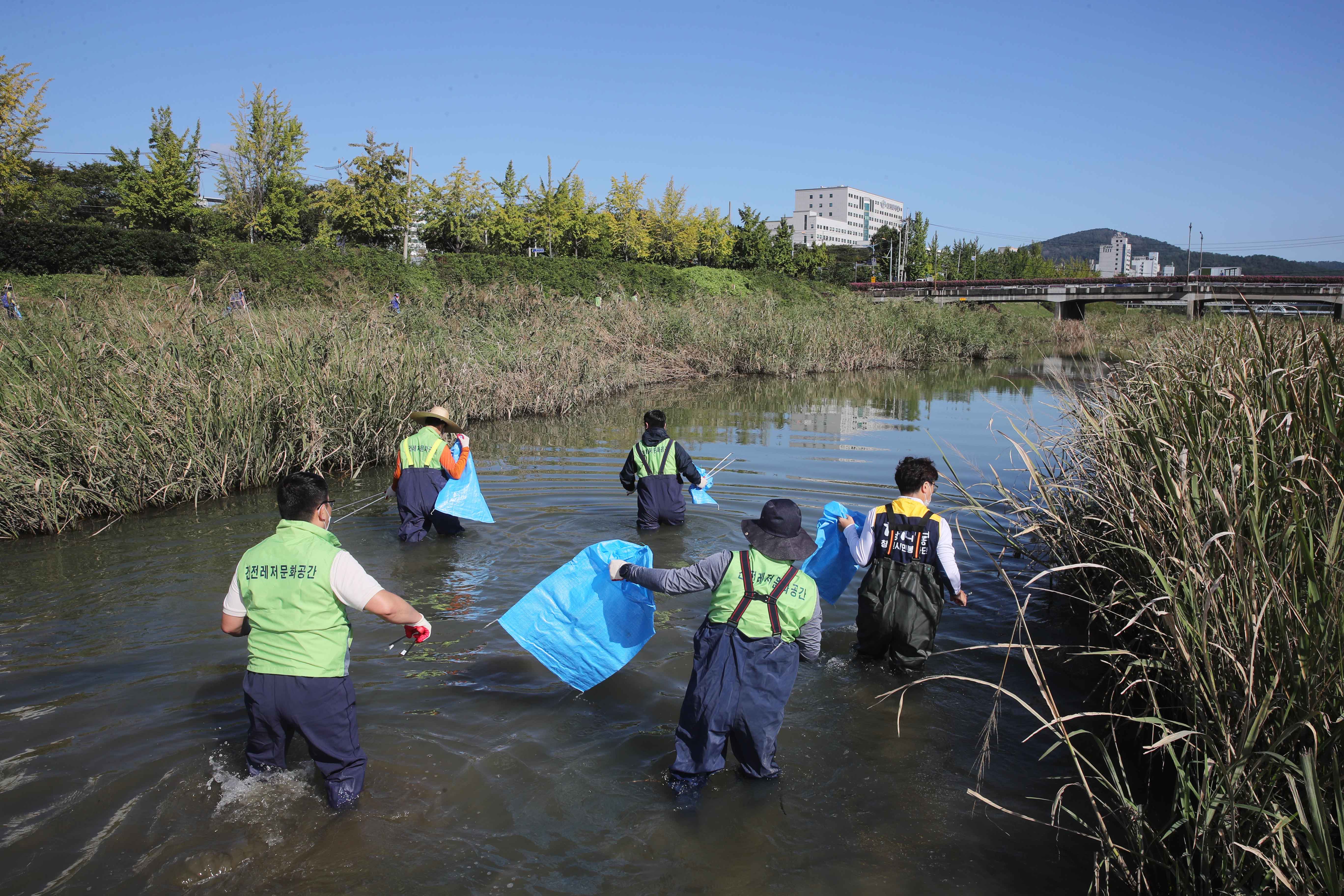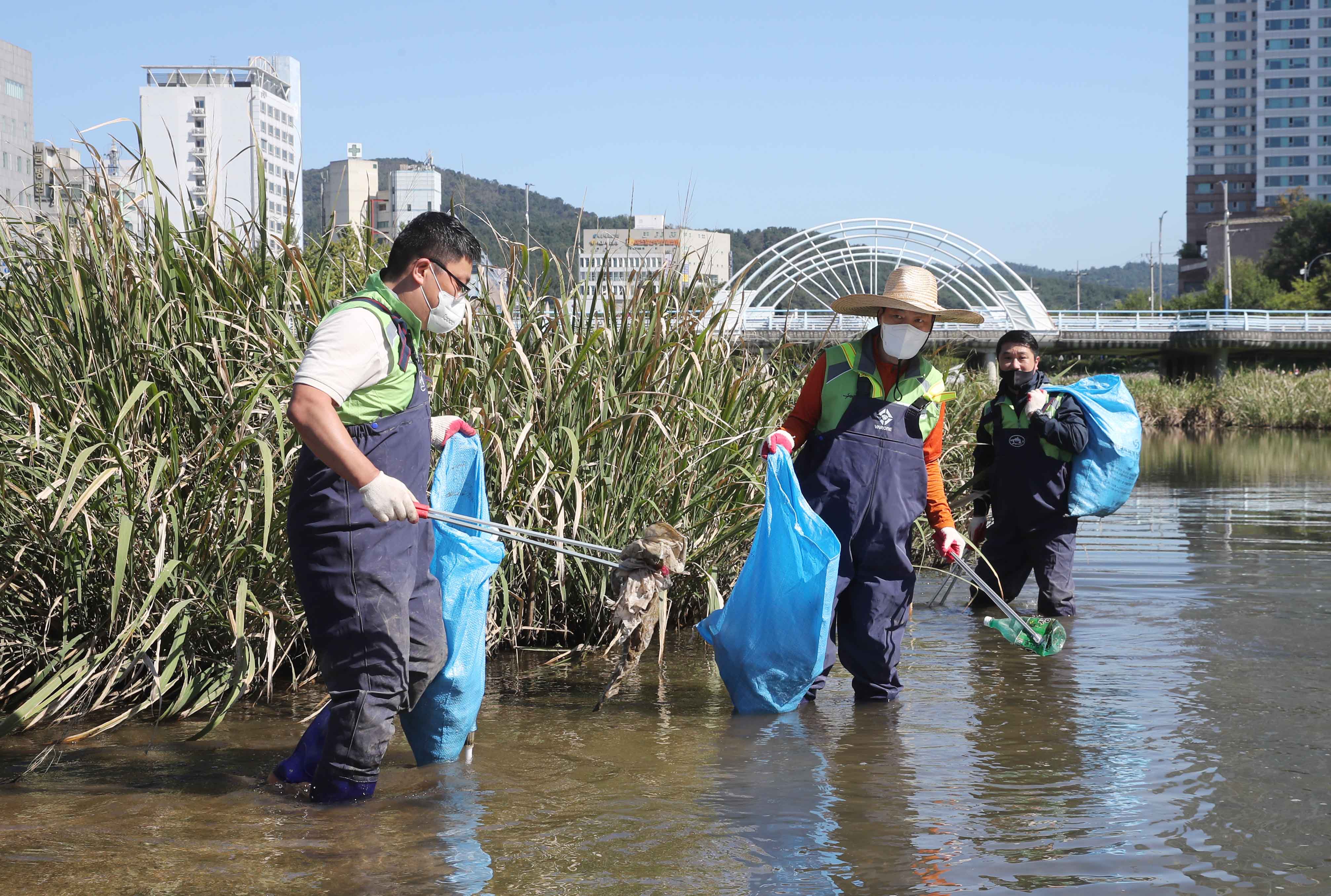 제목 : 창원레포츠파크 ‘두바퀴 사랑의 봉사단’ 창원천 살리기 앞장 - 레포츠파크, 큰울타리봉사회, 창원시민봉사회 3개 단체 공동 플로깅 창원레포츠파크(이사장 김도훈) 두바퀴 사랑의 봉사단은 14일 민간 봉사단체와 합동으로 창원천 일대에서 플로깅 활동을 펼쳤다. 플로깅(plogging)이란 이삭을 줍는다는 스웨덴어 ‘plocka upp’과 영어 ‘jogging’의 합성어로, 걷거나 뛰며 쓰레기를 줍는 환경보호 활동을 말한다. 이날 플로깅에는 레포츠파크 홍명표 상임이사를 비롯해 민간 봉사단체인 큰울타리봉사회 이문순 회장과 회원 15명, 창원시민봉사회 조성진 회장과 회원 12명, 레포츠파크 직원 19명 등 3개 단체 47명이 참여했다. 레포츠파크와 민간 봉사단체는 8.63km에 이르는 창원천 일대에서 50ℓ봉투 25개 분량의 쓰레기를 수거하며 창원천의 수질과 환경 개선에 기여했다. 레포츠파크는 이번 창원천 살리기 활동 외에도 지난 8월부터 관내 지역을 대상으로 각 팀별로 플로깅 활동을 펼쳐왔다. 홍명표 상임이사는 “수달과 연어, 은어가 들어오는 우리 지역의 생태하천인 창원천 지키기에 일조할 수 있어 소중한 시간이었다”며 “시민에게 사랑받는 공기업이 되기 위해 경륜과 누비자 사업 등 고유의 업무 외에도 지역을 위한 다양한 활동을 전개토록 하겠다”고 말했다. * 사진 있습니다. 끝. |