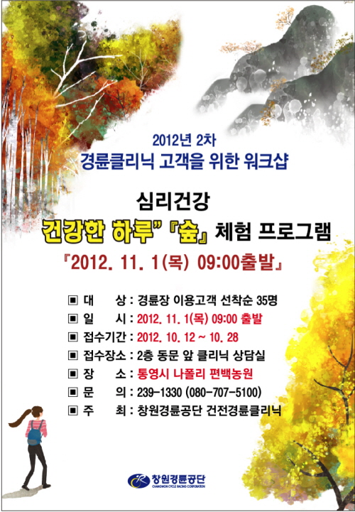 “건강한 하루” 『숲』체험 프로그램 ▣대 상 : 경륜장 이용고객 선착순 35명 ▣일 시 : 2012. 11. 1(목)09:00 출발 ▣접수기간 : 2012. 10. 12~ 10. 28 ▣접수장소 : 2층 동문 앞 클리닉 상담실 ▣장 소 : 통영시 나폴리 편백농원 ▣문 의 : 239. 1330(080-707-5100) ▣주 최 : 창원경륜공단 건전경륜클리닉 |