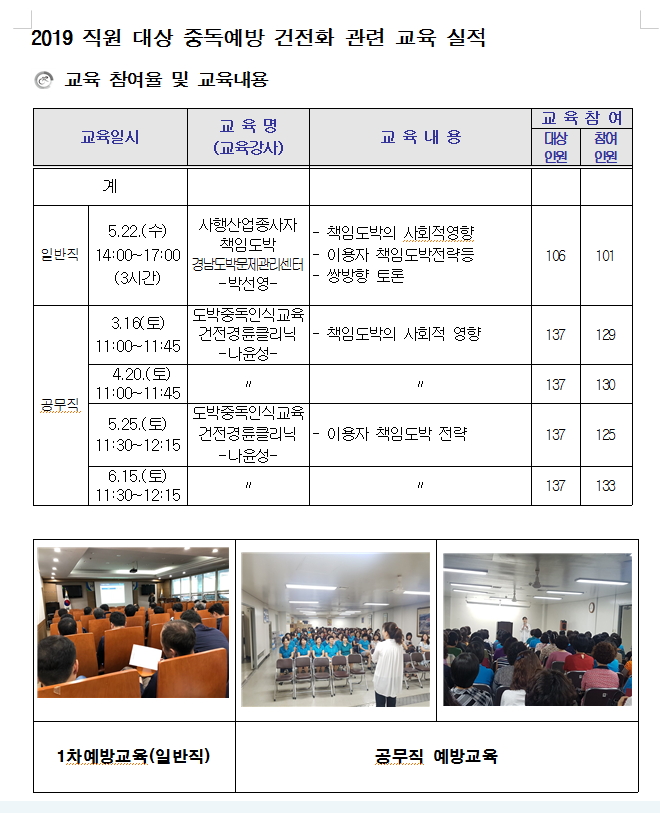 2019 직원대상 중독예방교육 실시 - 대상 : 일반직 및 공무직 |