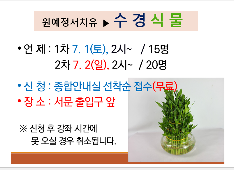 | 첨부파일 | 수경식물안내문.png(128KB)원예정서치유 수강자.hwpx(3MB) |