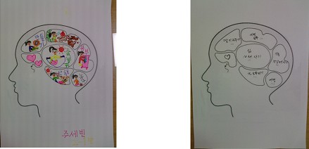- 주 제 : 빗속의 사람 그리기, 욕구두뇌, 가면완성하기 등 - 이용후기 : 1) 빗속의 사람 : 현재 큰 스트레스 상황 없이, 가족간의 단란한 모습을 표현하였다. 2) 욕구두뇌 : 모녀대상으로 활동이 이뤄졌으며, 현재의 바램을 통해 가족간의 이해를 돕는 과정이 되었다. 3) 가면만들기 : 가면을 완성해가는 과정에서 모녀간의 친밀감을 형성하고 확인하는 시간이었다. |