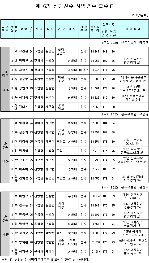 | 16기 신인선수 시범경주 출주표 3일차 (09.11.08) | |