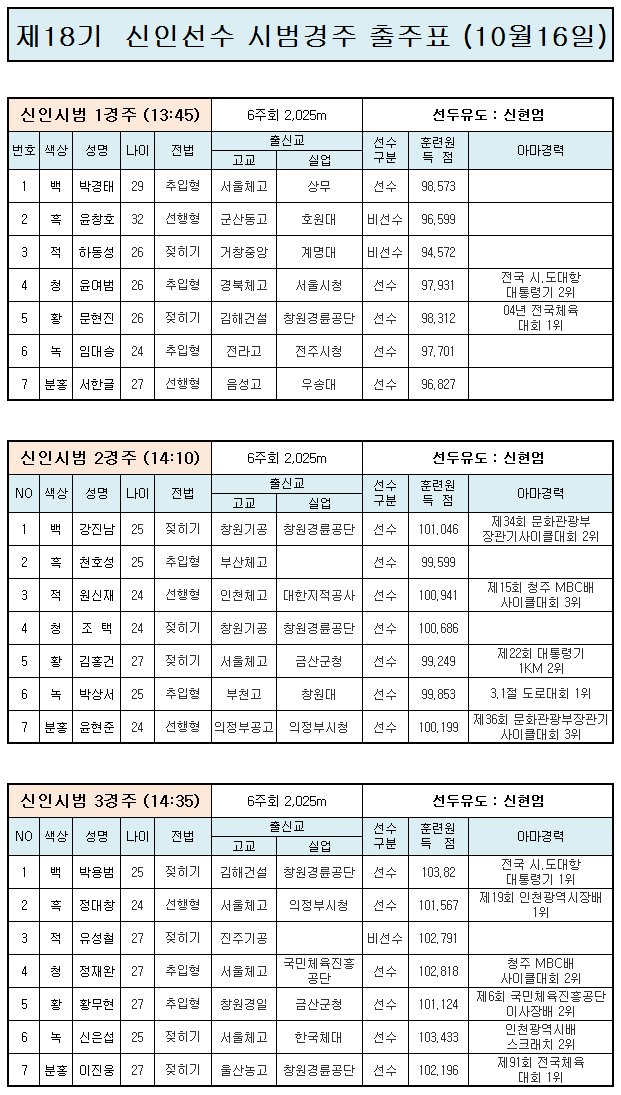 | 제18기 경륜선수 시범경주 출주표 (창원 2일차) | |