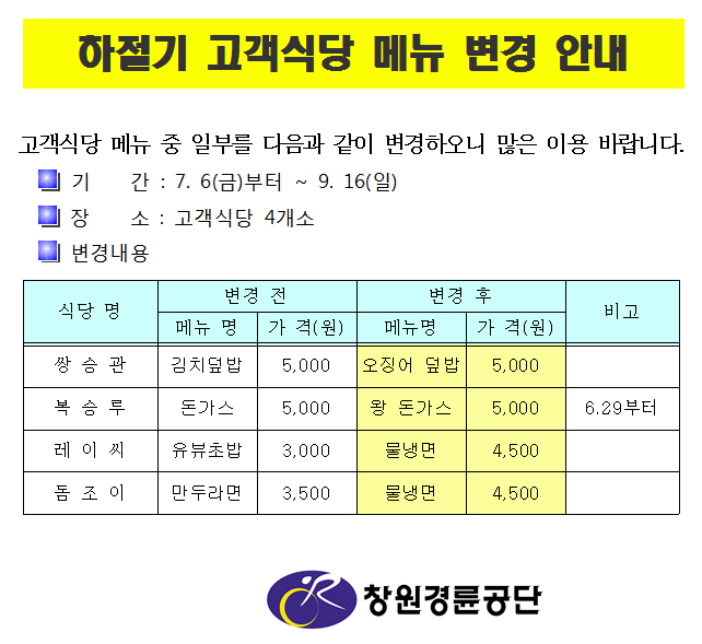 | 하절기 고객식당 메뉴 변경 안내 | |