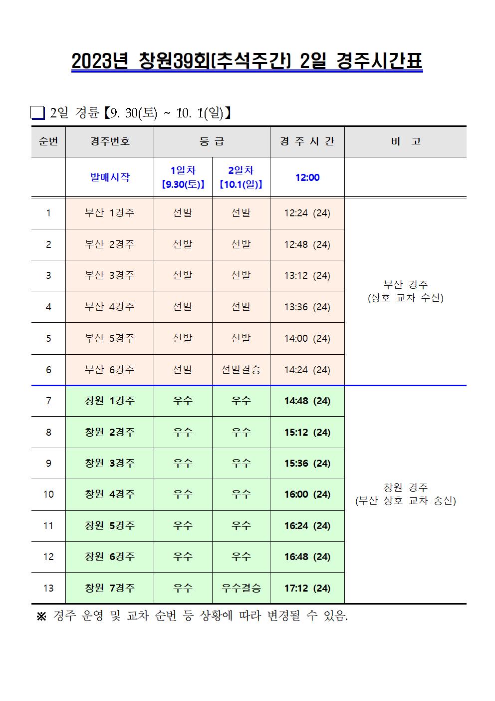 | 창원 제39회(추석 2일 경륜), 제40회(한글날 4일 경륜) 경주시간표 안내 | |