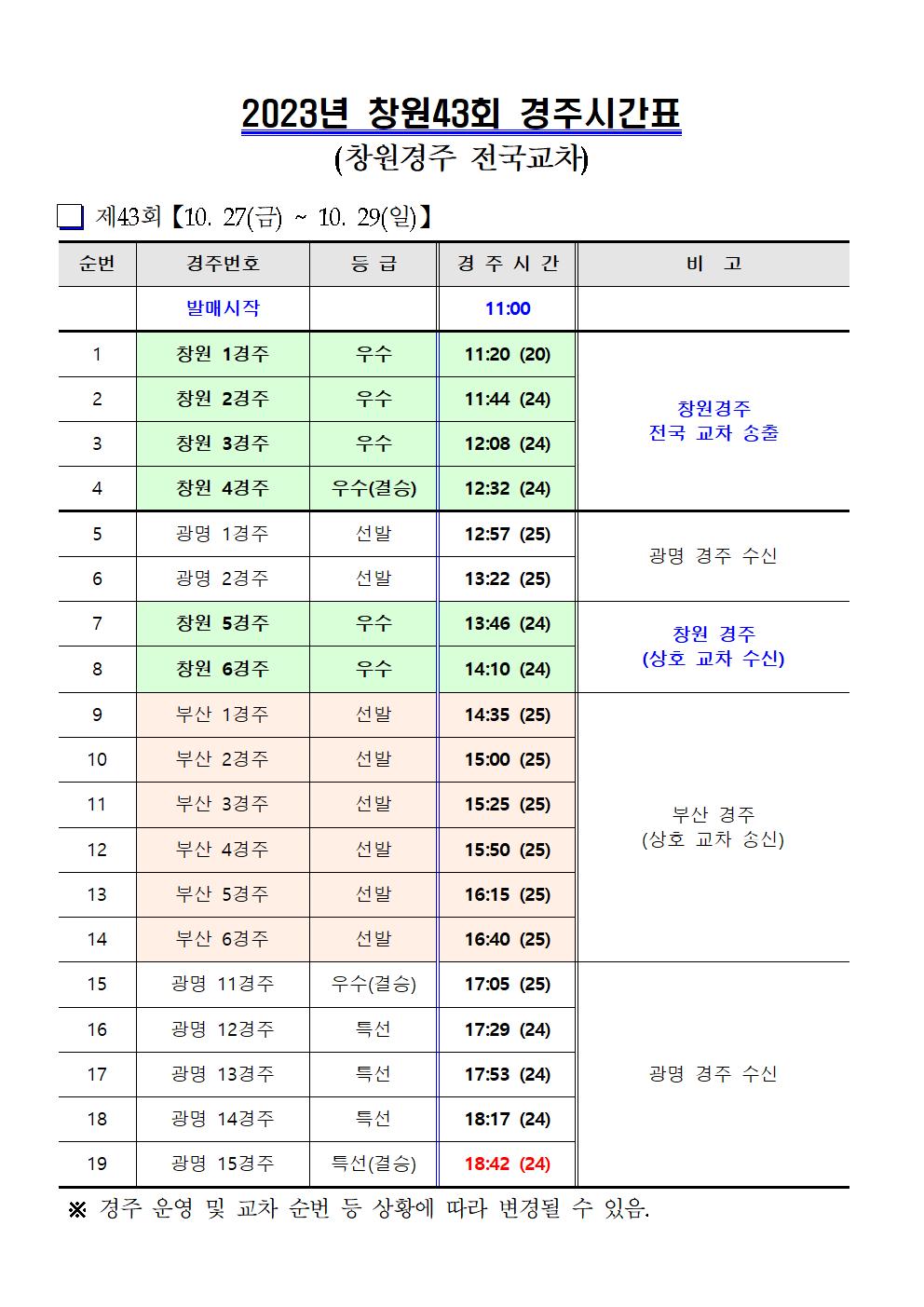 | 창원경륜 10월(41~43회) 경주운영 및 시간표 안내 | |
