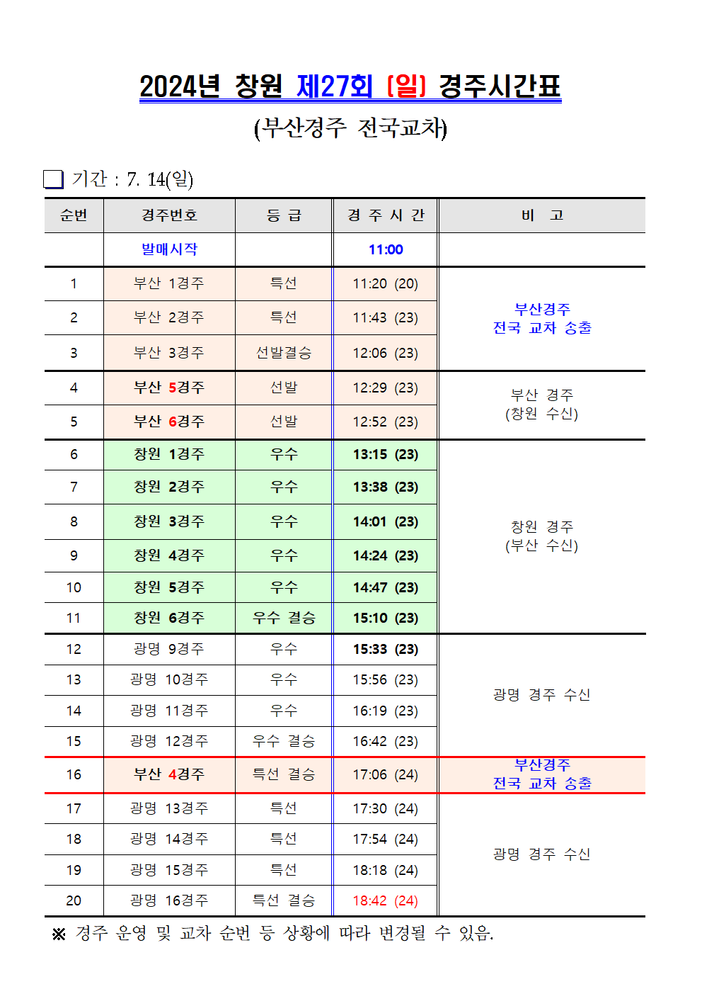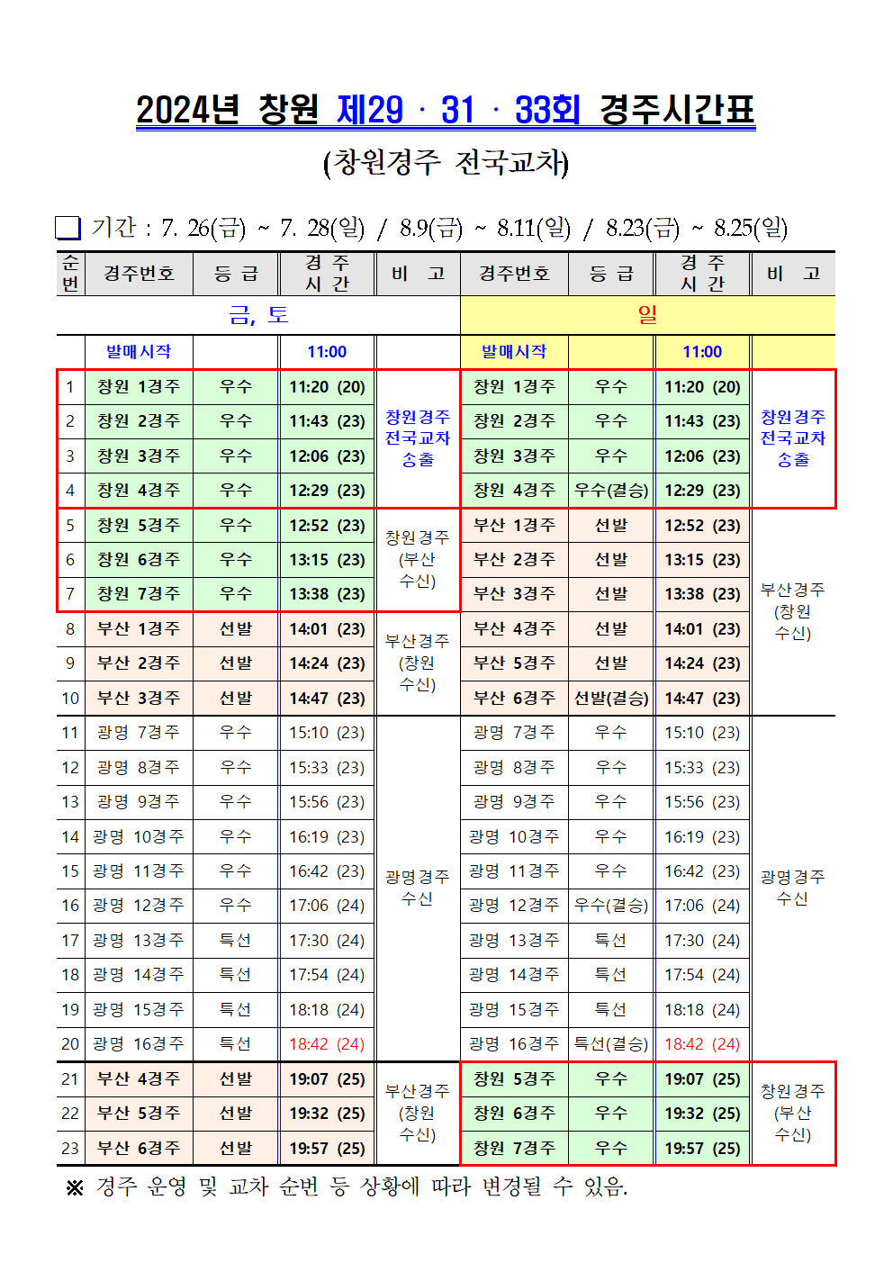 | 창원경륜 7월~8월 (제26~33회) 경주시간표 안내 | |