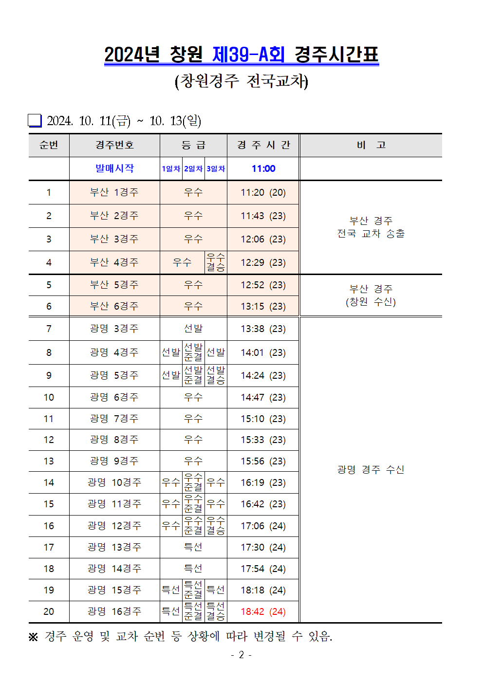 | 창원경륜 10월 (제39~41회) 경주시간표 안내 | |