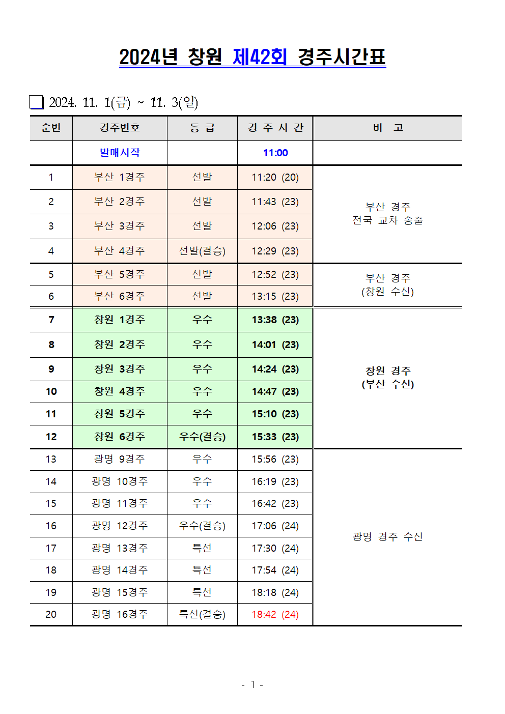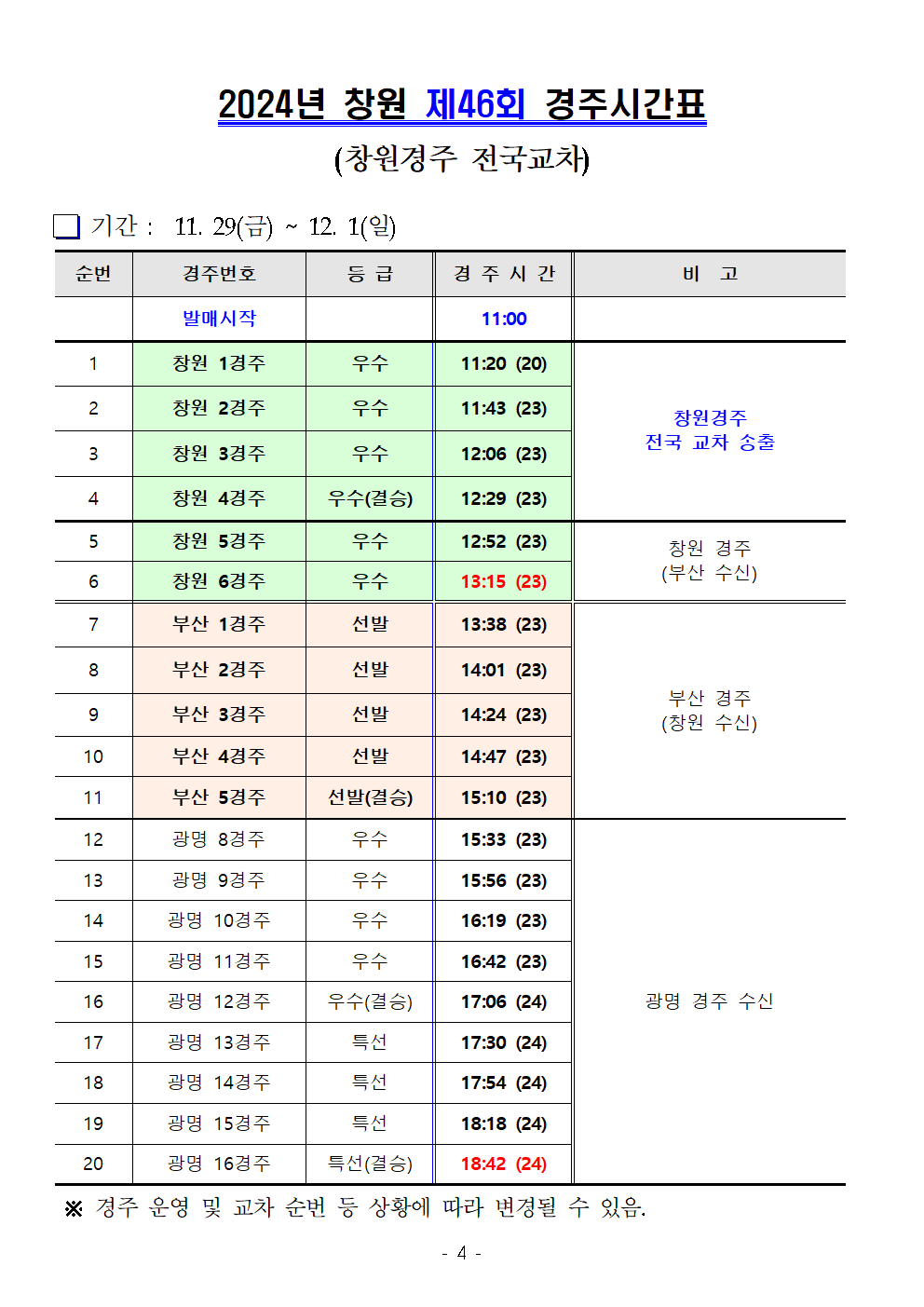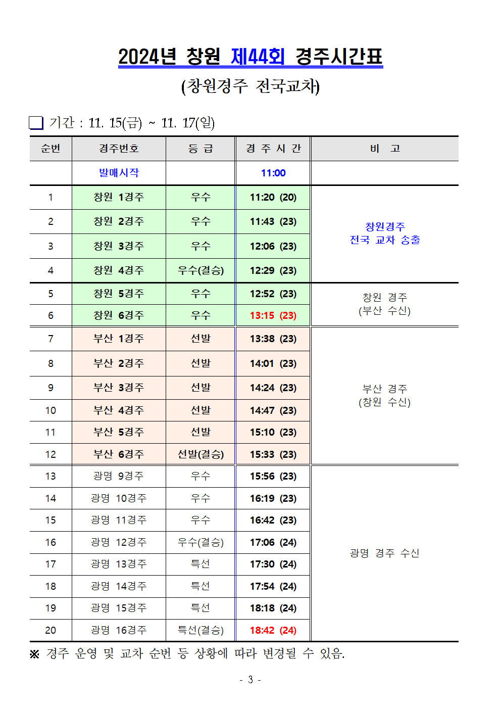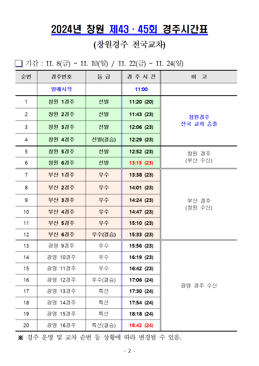| 창원경륜 11월 (제42~46회) 경주시간표 안내 | |