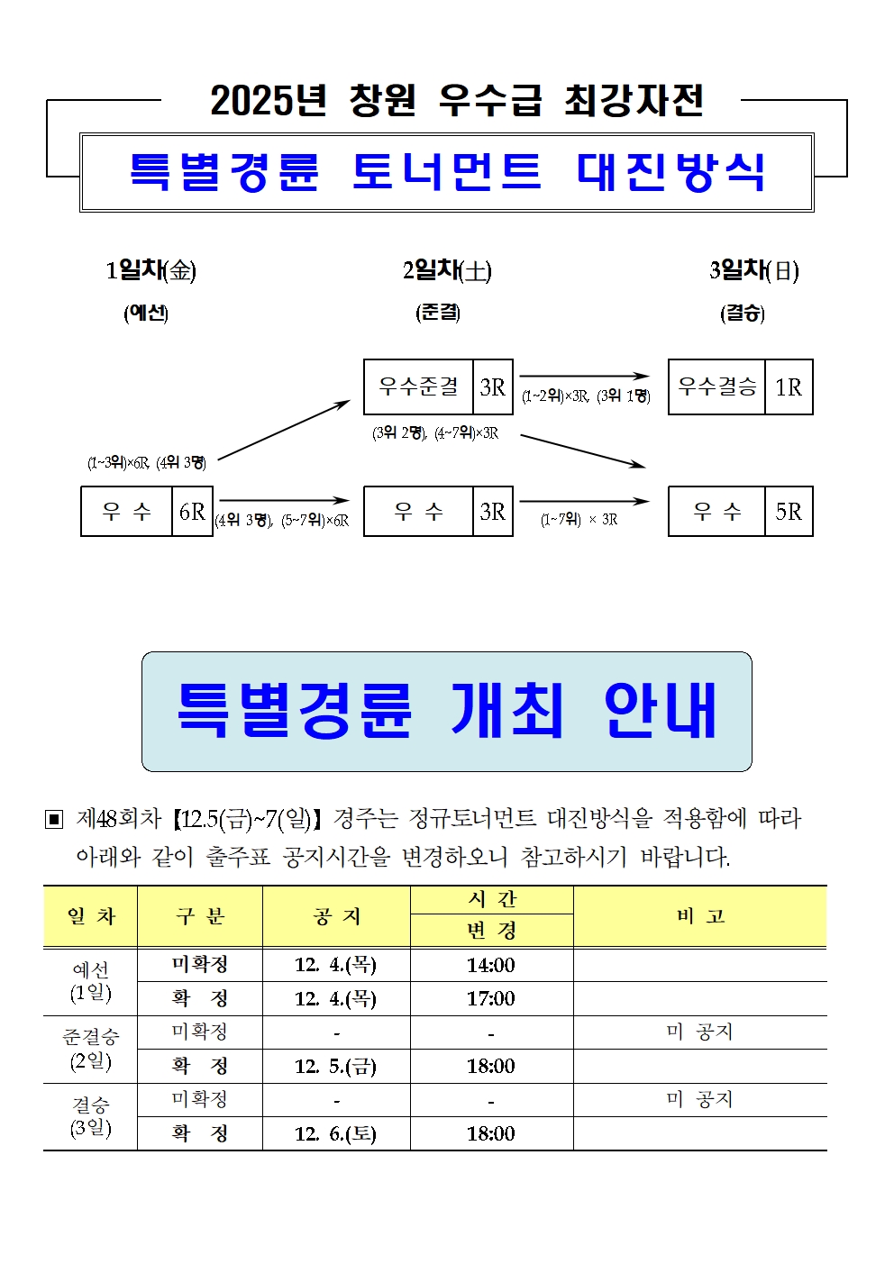 | 2025년 창원 우수급 최강자전 대진방식 및 출주표 공지시간 안내 | |