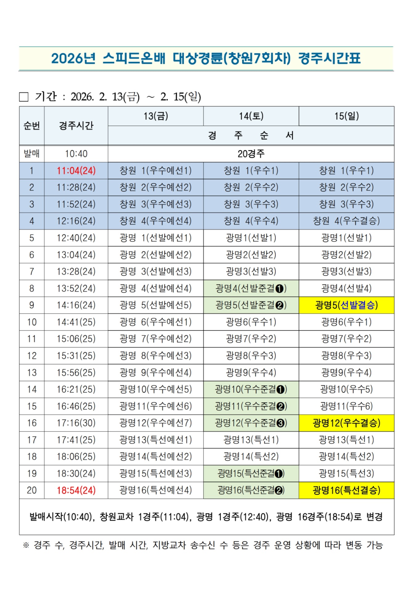 | 2026년 광명 - 스피드온배 대상경륜(창원7회차) 경주시간표 | |