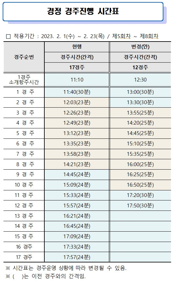 원활한 경주운영 및 고객편의 제고를 위해 다음과 같이 경정 경주 수를 변경하여 시행합니다. ㅇ변경내용 : 경주 수 축소