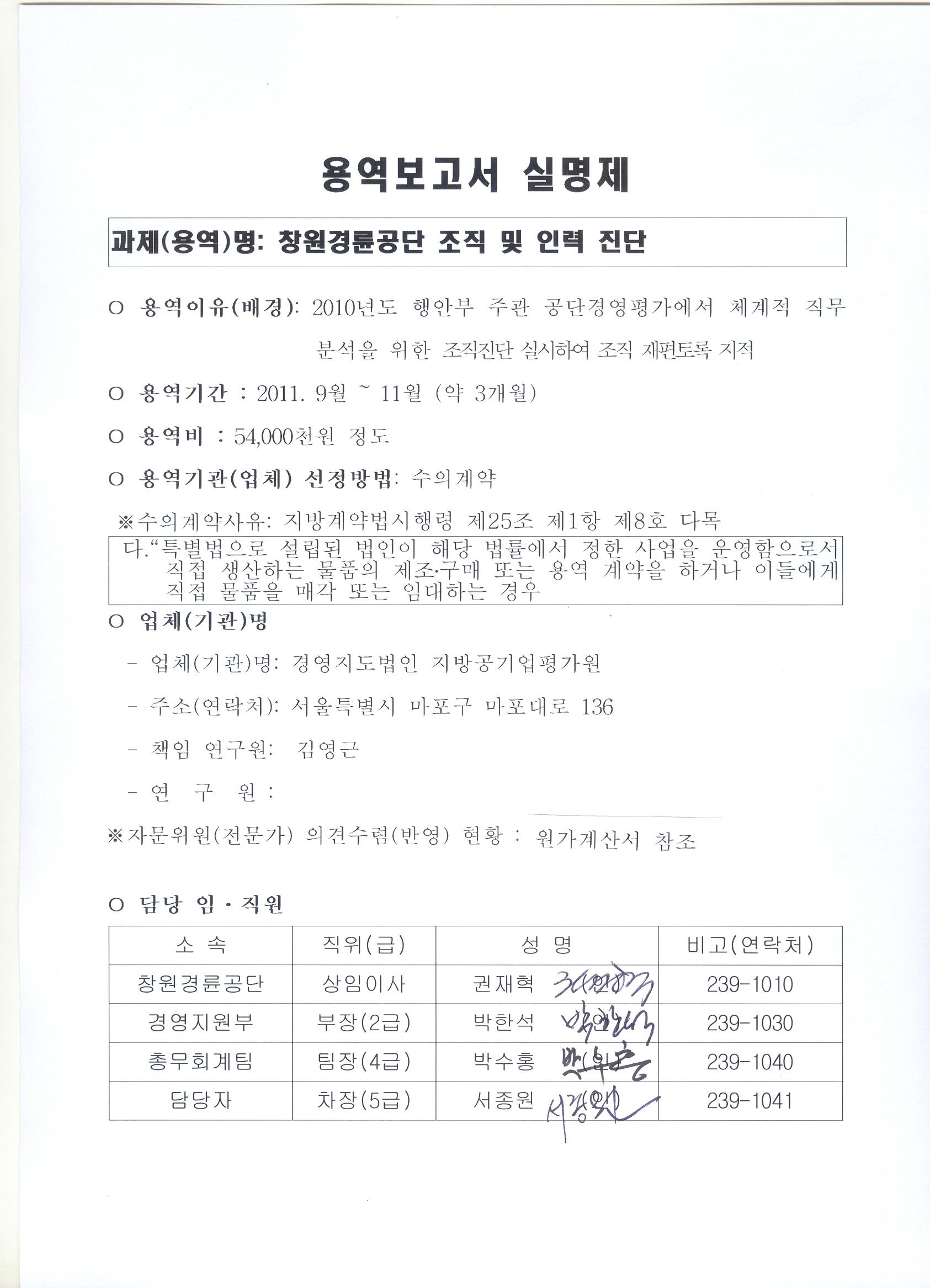 ○ 용역이유(배경): 2010년도 행안부 주관 공단경영평가에서 체계적 직무 분석을 위한 조직진단을 실시하여 조직 재편토록 지적에 따른 조직 및 인력진단 실시 ○ 용역기간 : 2011. 9월 ~ 11월 (약 3개월) ○ 용역비 : 54,000천원 정도 ○ 용역기관(업체) 선정방법: 수의계약 ※수의계약사유: 지방계약법시행령 제25조 제1항 제8호 다목