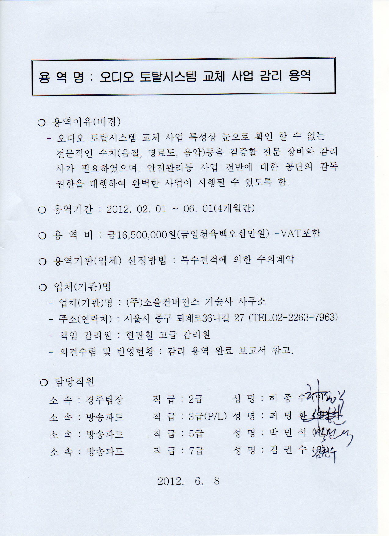 ? 용역이유(배경) - 오디오 토탈시스템 교체 사업 특성상 눈으로 확인 할 수 없는 전문적인 수치(음질, 명료도, 음압)등을 검증할 전문 장비와 감리사가 필요하였으며, 안전관리등 사업 전반에 대한 공단의 감독 권한을 대행하여 완벽한 사업이 시행될 수 있도록 함. ? 용역기간 : 2012. 02. 01 ~ 06. 01(4개월간) ? 용 역 비 : 금16,500,000원(금일천육백오십만원) -VAT포함 ? 용역기관(업체) 선정방법 : 복수견적에 의한 수의계약 ? 업체(기관)명 - 업체(기관)명 : (주)소울컨버전스 기술사 사무소 - 주소(연락처) : 서울시 중구 퇴계로36나길 27 (TEL.02-2263-7963) - 책임 감리원 : 현관철 고급 감리원 - 의견수렴 및 반영현황 : 감리 용역 완료 보고서 참고.