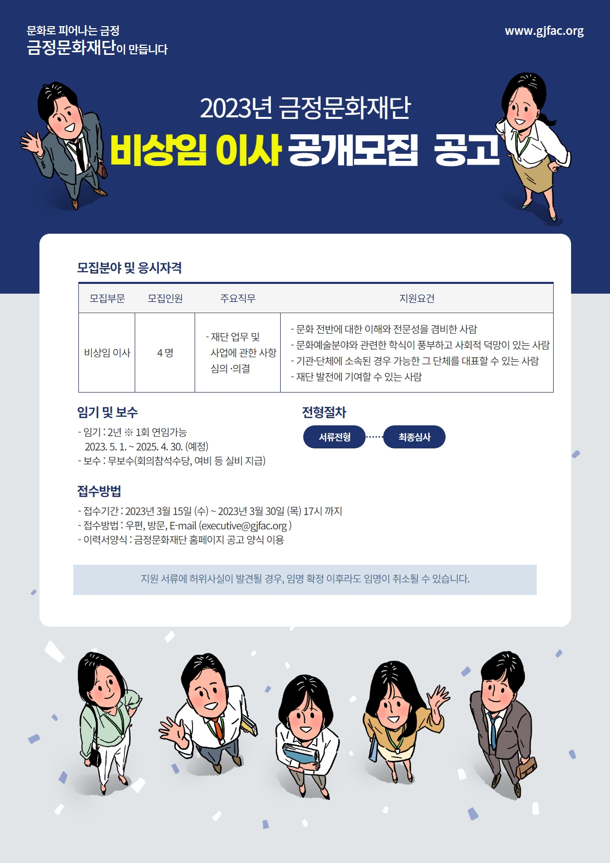 | 첨부파일 | 2023년 금정문화재단 임원(이사) 공개모집 공고문.hwpx(39KB)(재)금정문화재단 2023년 임원(비상임 이사) 공개모집 공고.jpg(531KB) |