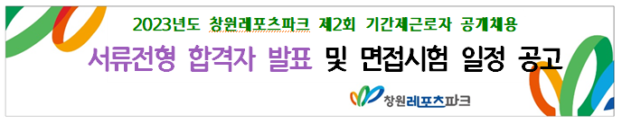 | 2023년도 창원레포츠파크 제2회 기간제근로자 공개채용 서류전형 합격자 발표 및 면접시험 일정 공고 | |