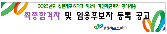 | 2023년도 창원레포츠파크 제2회 기간제근로자 공개채용 최종합격자 및 임용후보자 등록 공고 | |