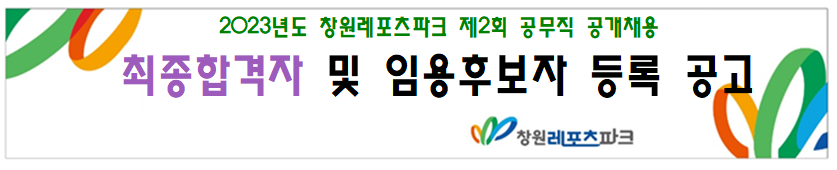 | 2023년도 창원레포츠파크 제2회 공무직 공개채용 최종합격자 및 임용후보자 등록 공고 | |