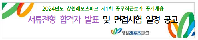 | 2024년도 창원레포츠파크 제1회 공무직근로자 공개채용 서류전형 합격자 발표 및 면접시험 일정 공고 | |