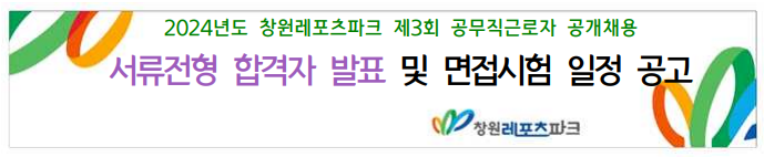 | 2024년도 창원레포츠파크 제3회 공무직근로자 공개채용 서류전형 합격자 발표 및 면접시험 일정 공고 | ||