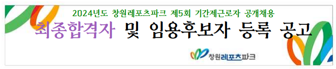 | 2024년도 창원레포츠파크 제5회 기간제근로자 공개채용 최종합격자 및 임용후보자 등록 공고 | |