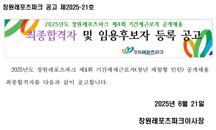 | 2025년도 창원레포츠파크 제4회 기간제근로자 공개채용 최종합격자 및 임용후보자 등록 공고 | |