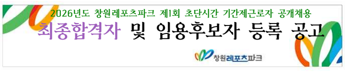 | 2026년도 창원레포츠파크 제1회 초단시간 기간제근로자 공개채용 최종합격자 및 임용후보자 등록 공고 | |