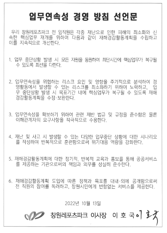 | 창원레포츠파크 업무연속성 경영방침 | |