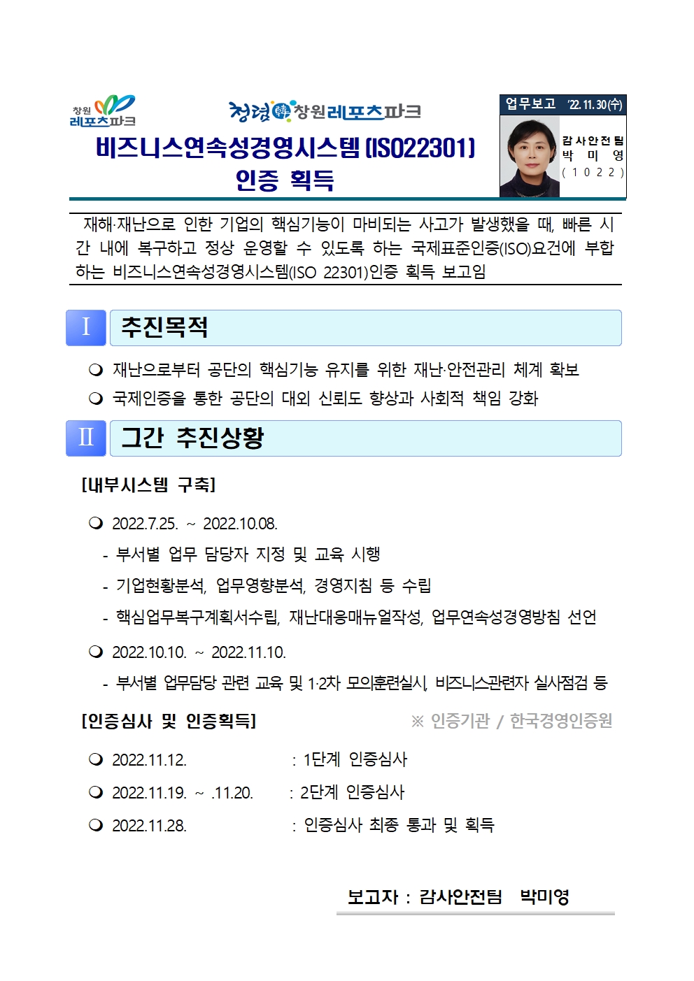 | 비즈니스연속성경영시스템(ISO223010인증 획득 결과 보고 | |