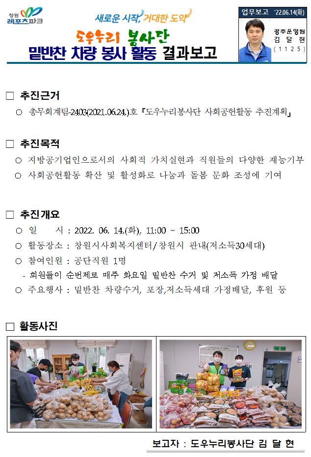 □ 추진목적 ○ 지방공기업인으로서의 사회적 가치실현과 직원들의 다양한 재능기부 ○ 사회공헌활동 확산 및 활성화로 나눔과 돌봄 문화 조성에 기여 □ 추진개요 ○ 일 시 : 2022. 06. 14.(화), 11:00 ~ 15:00 ○ 활동장소 : 창원시사회복지센터/창원시 관내(저소득30세대) ○ 참여인원 : 공단직원 1명 - 회원들이 순번제로 매주 화요일 밑반찬 수거 및 저소득 가정 배달 ○ 주요행사 : 밑반찬 차량수거, 포장,저소득세대 가정배달, 후원 등