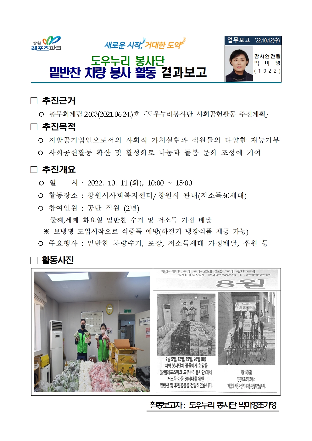 | 도우누리 봉사단 밑반찬 차량 봉사 활동 결과보고(10월) | |