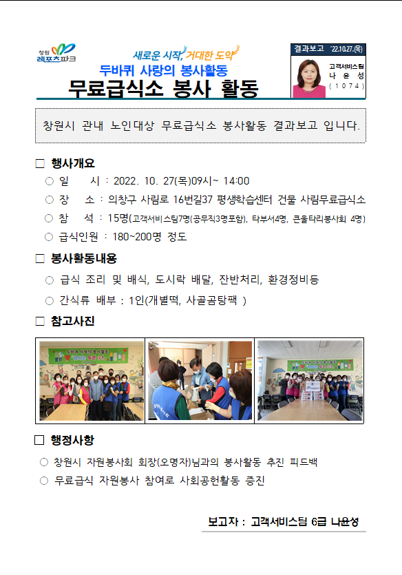 창원레포츠파크 두바퀴 사랑의 봉사단이 27일 창원시 의창구 소재 사림 무료급식소를 찾아 무료급식 봉사활동을 벌였다.
