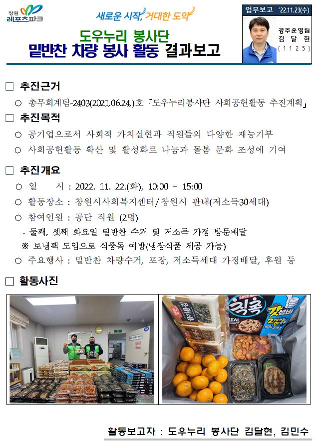| 도우누리 봉사단 밑반찬 차량 봉사 활동 결과보고(11월22일) | |