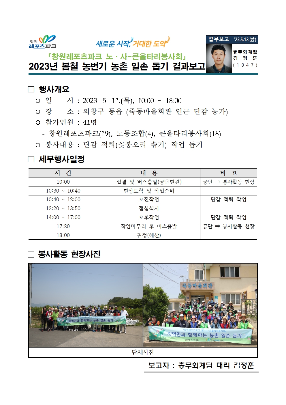 ◇ 일 시 : 2023. 5. 11.(목), 10:00 ~ 18:00 ◇ 장 소 : 창원시 의창구 동읍(죽동마을회관 인근 단감 농가) ◇ 참석인원 : 41명(창원레포츠파크 19명 / 노동조합 4명 / 큰울타리봉사회 18명) ◇ 봉사내용 : 단감 적뢰(꽃봉오리 솎기) 작업 돕기 |
