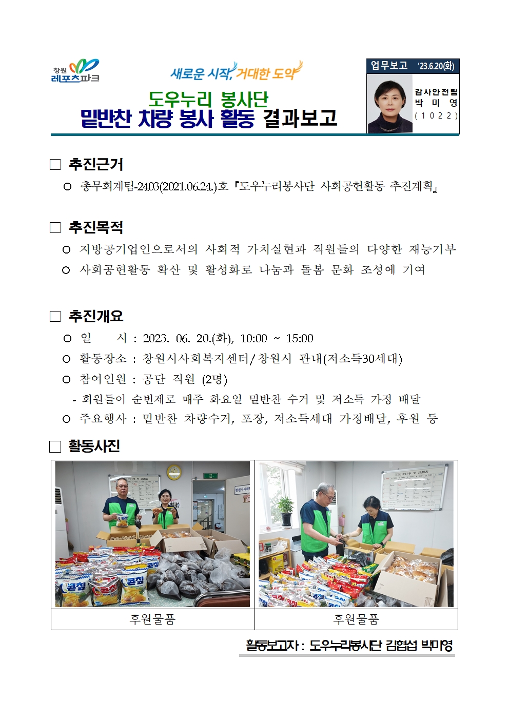 □ 추진개요 ○ 일 시 : 2023. 06. 20.(화), 10:00 ~ 15:00 ○활동장소 : 창원시사회복지센터/창원시 관내(저소득30세대) ○참여인원 : 공단 직원 (2명) - 매주 화요일 순번제로 밑반찬 수거 및 저소득 가정에 배달 방문 ○주요행사 : 밑반찬 차량수거, 포장, 저소득세대 가정배달, 후원 등 |