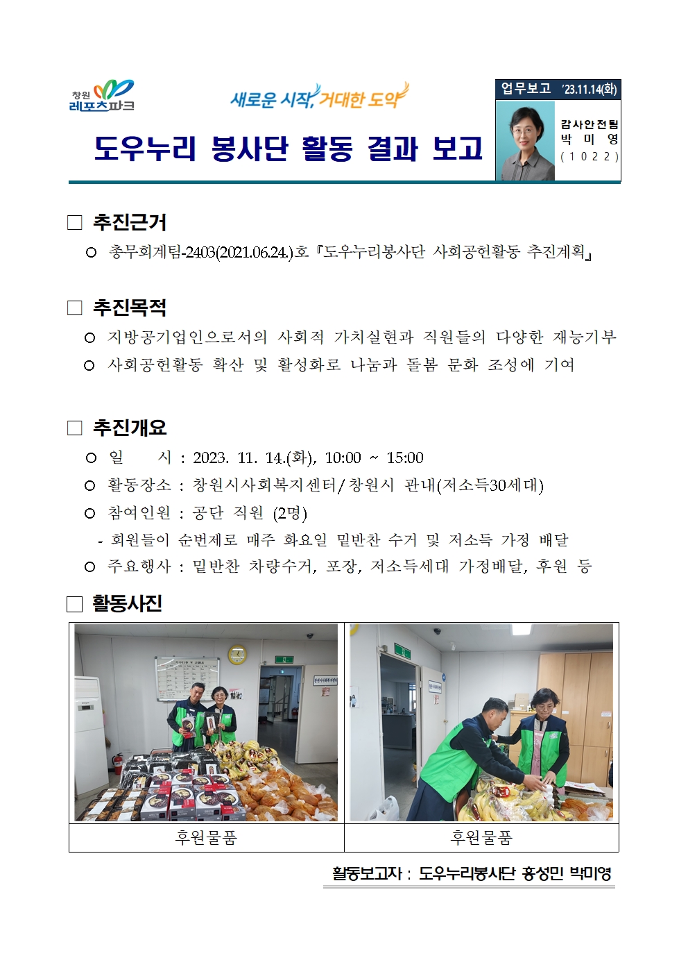 □ 추진개요 ○ 일 시 : 2023. 11. 14.(화), 10:00 ~ 15:00 ○ 활동장소 : 창원시사회복지센터/창원시 관내(저소득30세대) ○ 참여인원 : 공단 직원 (2명) - 회원들이 순번제로 매주 화요일 밑반찬 수거 및 저소득 가정 배달 ○ 주요행사 : 밑반찬 차량수거, 포장, 저소득세대 가정배달, 후원 등 |
